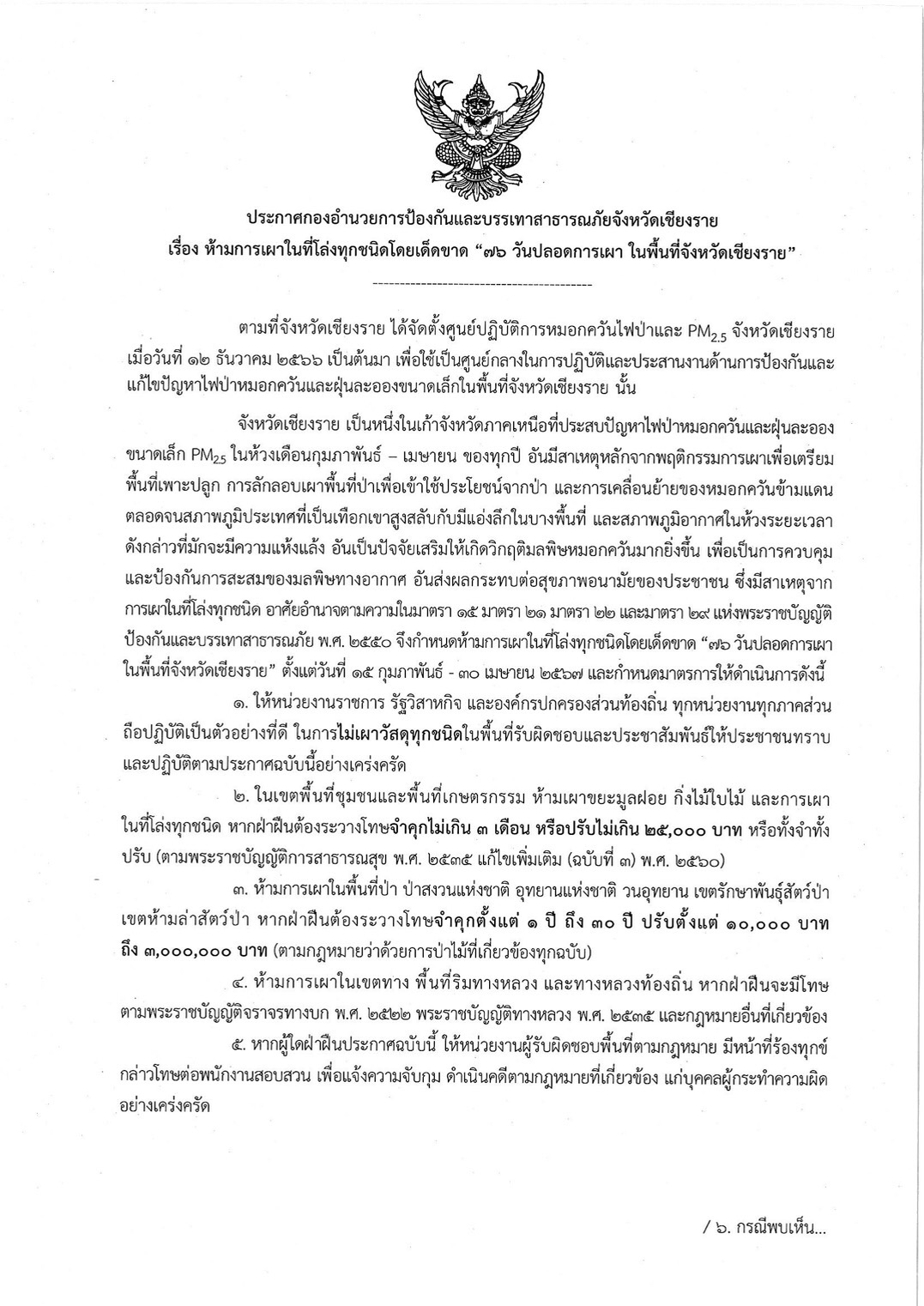 3. ห้ามการเผาในพื้นที่ป่า ป่าสงวนแห่งชาติ อุทยานแห่งชาติ วนอุทยาน เขตรักษาพันธุ์สัตว์ป่าเขตห้ามล่าสัตว์ป่า หากฝ่าฝืนต้องระวางโทษจำคุกตั้งแต่ 1 ปี ถึง 30 ปี ปรับตั้งแต่ 10,000 บาทถึง 3,000,000 บาท (ตามกฎหมายว่าด้วยการป่าไม้ที่เกี่ยวข้องทุกฉบับ)