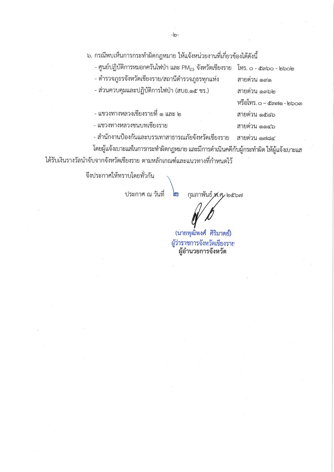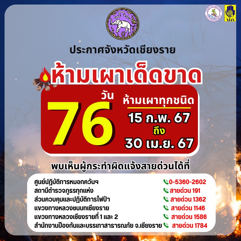 -ศูนย์ปฏิบัติการหมอกควันไฟป่า และ PM 2.5 จังหวัดเขียงราย โทร. 0 - 5360 - 2602