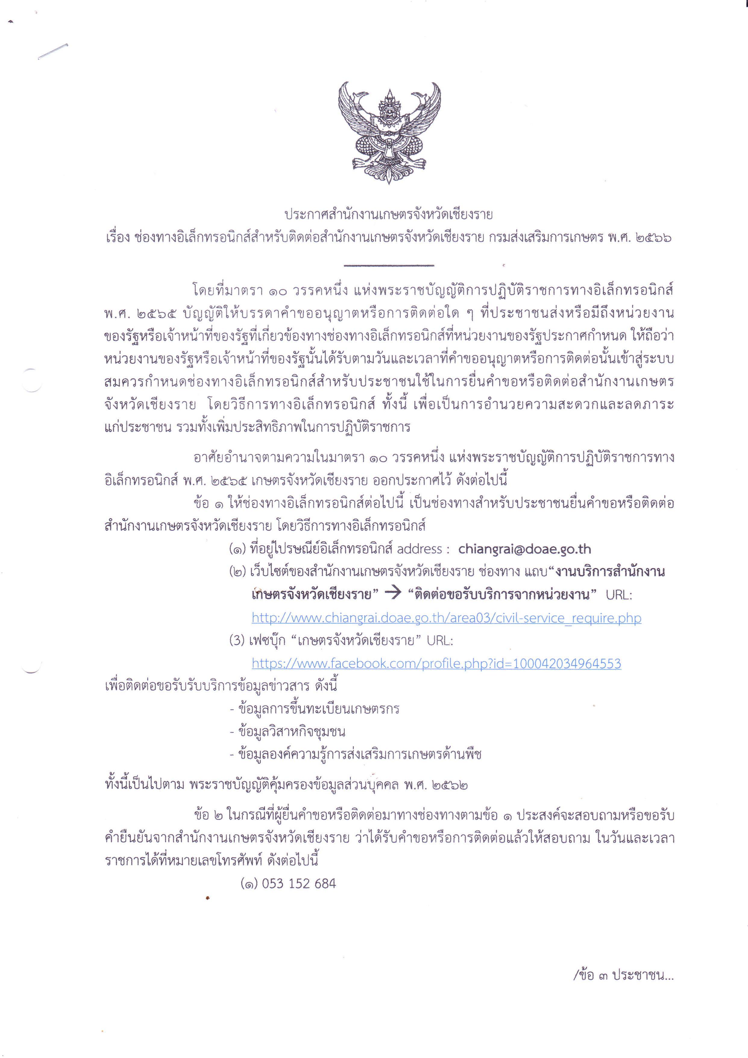 ข้อ ๑ ให้ช่องทางอิเล็กทรอนิกส์ต่อไปนี้ เป็นช่องทางสำหรับประชาชนยื่นคำขอหรือติดต่อสำนักงานเกษตรจังหวัดเชียงราย โดยวิธีการทางอิเล็กทรอนิกส์