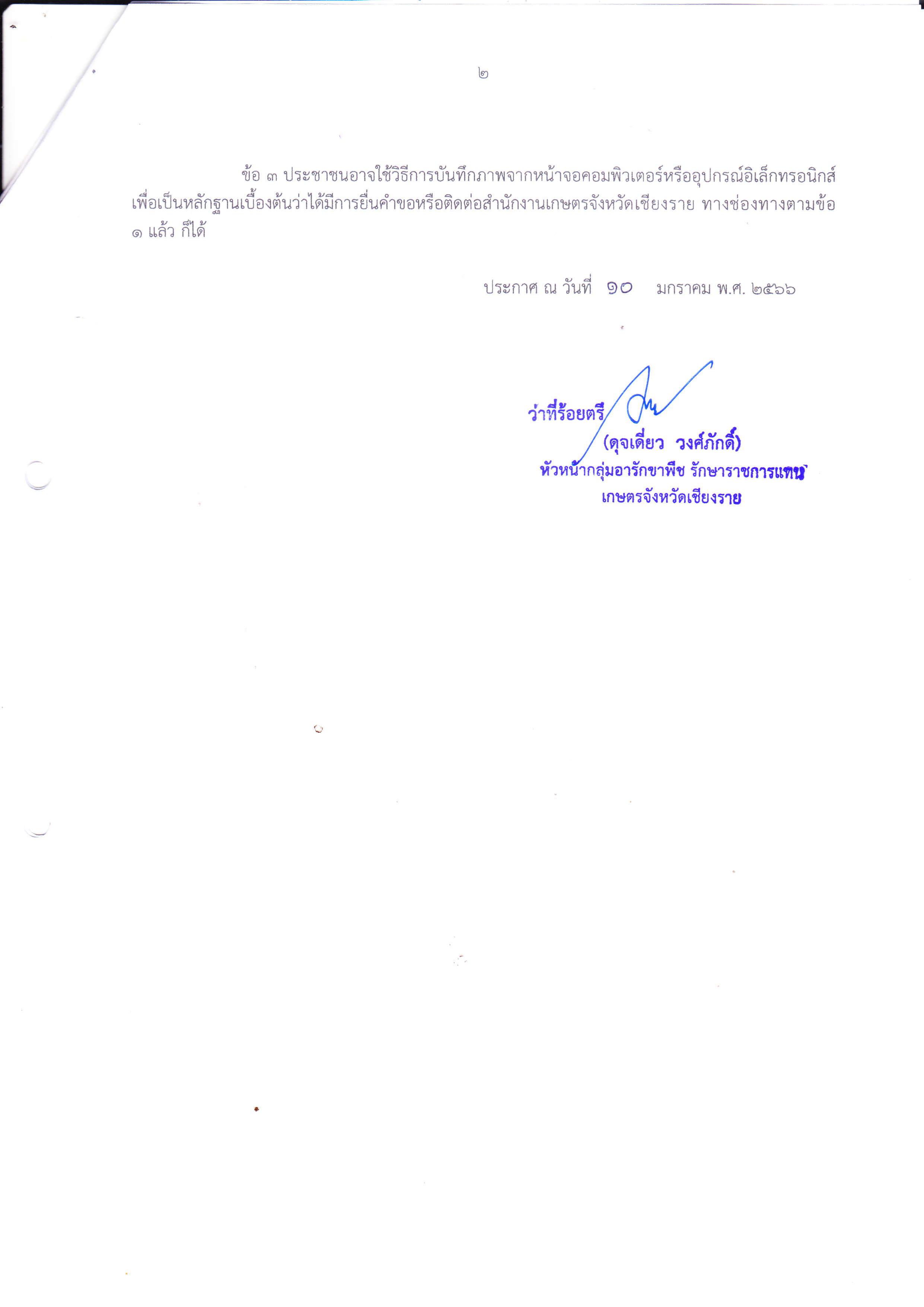 ข้อ ๓ ประชาชนอาจใช้วิธีการบันทึกภาพจากหน้าจอคอมพิวเตอร์หรืออุปกรณ์อิเล็กทรอนิกส์เพื่อเป็นหลักฐานเบื้องต้นว่าได้มีการยื่นคำขอหรือติดต่อสำนักงานเกษตรจังหวัด เชียงราย ทางช่องทางตามข้อ ๑ แล้ว ก็ได้